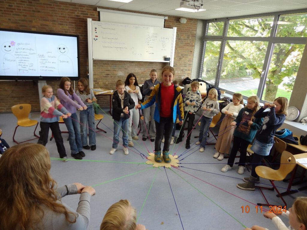 An die­sem Tag kön­nen die FAIR­mitt­ler ihre erwor­be­nen Kom­pe­ten­zen aus der Streit­schlich­ter­aus­bil­dung sinn­voll ein­brin­gen. Inhal­te die­ser Aus­bil­dung, wel­che alle Teilnehmer*innen des FAIRM­mitt­ler­teams in der Jahr­gangs­stu­fe 9 und 10 durch­lau­fen, sind u.a. Mode­ra­tor­sein, empa­thi­scher und ver­ant­wor­tungs­vol­ler Umgang sowie Vor­bild­sein. Die Zusam­men­ar­beit der alters­un­ter­schied­li­chen Schü­ler­grup­pen ermög­licht einen ande­ren Zugang zum Sozia­len Ler­nen als die Zusam­men­ar­beit auf der Ebe­ne Leh­rer-Schü­ler und ist eine sinn­vol­le, gewinn­brin­gen­de Erfah­rung für bei­de Schülergruppen.