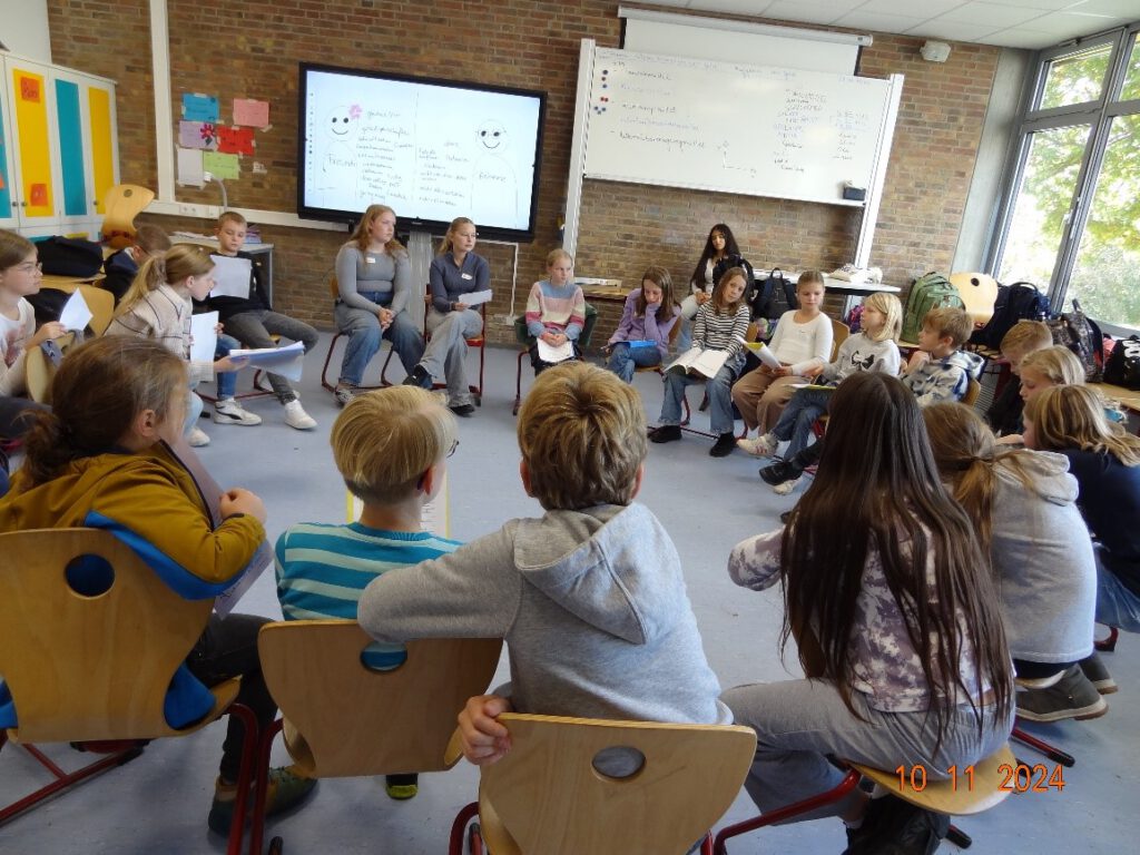 Mit den drei Schwer­punk­ten „Mit Ärger umge­hen“, „Viel­fäl­ti­ge Gefüh­le“ und „Freund­schaft“ füh­ren die FAIR­mitt­ler die neu­en Mitschüler*innen an ers­te wich­ti­ge The­men des sozia­len Ler­nens her­an und haben so auch die Mög­lich­keit, ihre neu­en Mitschüler*innen ken­nen­zu­ler­nen und Ansprech­part­ner zu sein. Die Aus­ein­an­der­set­zung mit den oben genann­ten The­men ist ein ers­ter Bau­stein der Mob­bing­prä­ven­ti­on der Schule.