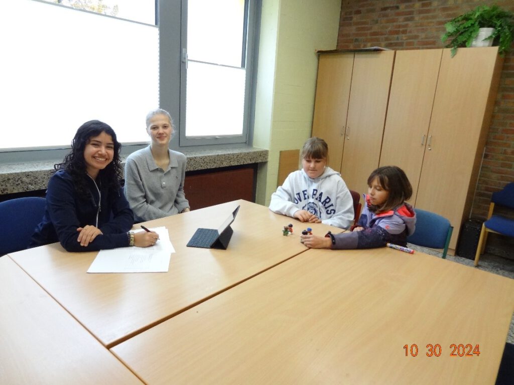 Fio­na und Ari­na aus der Jahr­gangs­stu­fe 6 stel­len gemein­sam mit den FAIR­mitt­lern Jus­ti­na Soli­man und Pau­la Spil­ker eine Situa­ti­on nach.