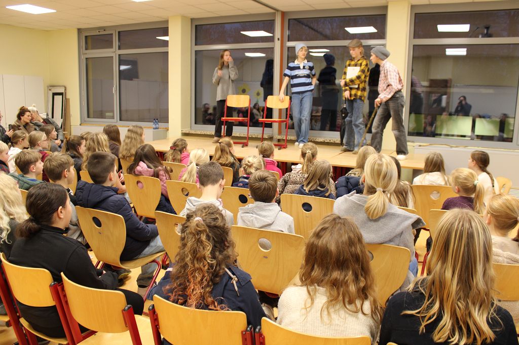 Nach der Begrüßung zeigten die SGS-Schulscouts aus den Klassen und 5 und 6 den Gästen von den Grundschulen ihre vielleicht neue Schule ab dem kommenden Schuljahr. In der Aula des Schulzentrums informierten Frau Wittmann, Erprobungsstufenkoordinatorin für die Jahrgänge 5 und 6, und Schulleiter Herr Harazim deren Eltern über das Schulprogramm und die Schullaufbahn am SGS. Danach konnten die jungen Gäste wieder gemeinsam durch die Schule gehen und Aktionen und Ausstellungen der Fachbereiche der Sprachen Deutsch, Englisch, Französisch und Lateinisch, der Mint-Fächer Mathematik, Biologie, Chemie und Physik, und der Fächer Kunst, Musik, Sport, Philosophie und Religion besuchen. Schülerinnen und Schüler aus der Theater-AG der Klasse 5–8 unter der Leitung von Herrn Volmer führten die kleine Szene „Einmal Australien und zurück“ vor, der SMS-Chor (Leitung: Herr Brödling) sang und die Roboter-AG, geleitet von Herrn Klose, präsentierte sich.