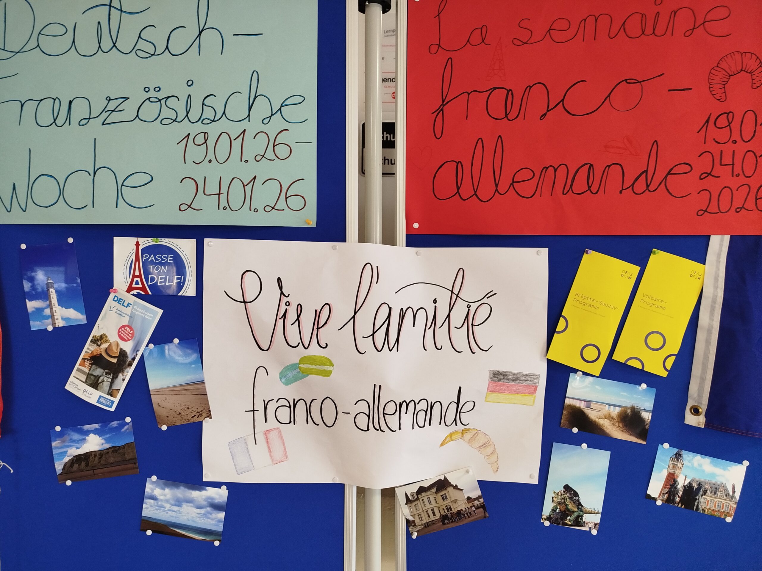 Unsere Partnerschule St. Martin in Marquise (Frankreich) wurde vorgestellt, Schülerinnen und Schüler boten französische Spezialitäten zum Verkauf an, es gab Informationen zum Sprachdiplom DELF und die Französischkurse nahmen am Internetteamwettbewerb des Institut français teil. Am Samstag, 24.1., fand schließlich die schriftliche DELF-Prüfung auf Niveau A1 statt.
