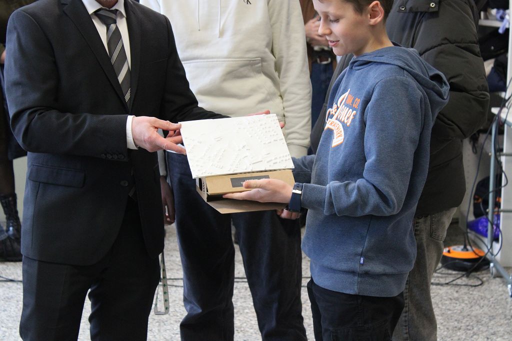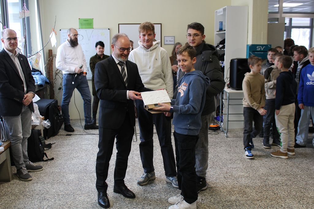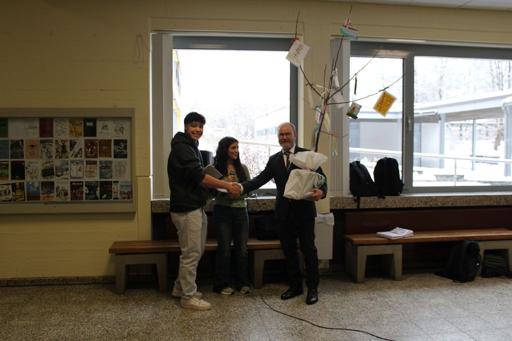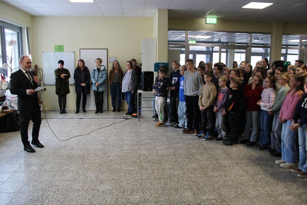 Schülerinnen und Schüler des SGS und die Schulgemeinde mit Vertretern der Elternschaft und des Fördervereins haben am 30. Januar 2026 Herrn Harazim verabschiedet, der knapp neun Jahre Schulleiter am Städtischen Gymnasium Steinheim war. Vor neun Jahren sang der Schulchor ein Lied mit selbst gedichtetem Text zur Begrüßung von Herrn Harazim und auch jetzt sangen die Schülerinnen und Schüler zusammen mit dem Schulchor ein Lied zum Abschied. Maiss Rhuma und Max Kremeier vom Schülersprecherteam bedankten sich mit einer Rede von ihrem Schulleiter und überreichten als Geschenk einen Apfelbaum zum Auspflanzen in den Garten, an den jede Klasse eine Verabschiedungskarte gehängt hatte. Die Kassensprecherinnen und Klassensprecher überreichten weitere Geschenke. Auch Herr Schollbach, der 1. Vorsitzende des Fördervereins des SGS, verabschiedete in seiner Rede den Schulleiter Herrn Harazim.